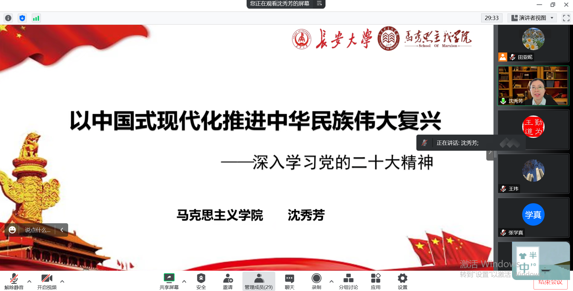 委员易秀、九三学社成员卢玉东、民盟委员会成员邓顺熙先后发言。大家一致表示要深入学习贯彻党的二十大精神,切实把党中央决策部署转化为学科建设和人才培养的新动力、新思路和新举措,发挥学院专业优势,培养专业人才,服务国家生态文明建设,服务国家发展战略,为加速推进中国式现代化的进程贡献力量。大家还分别就实现中国式现代化与集体主义精神之间的密切关系等问题进行了探讨。