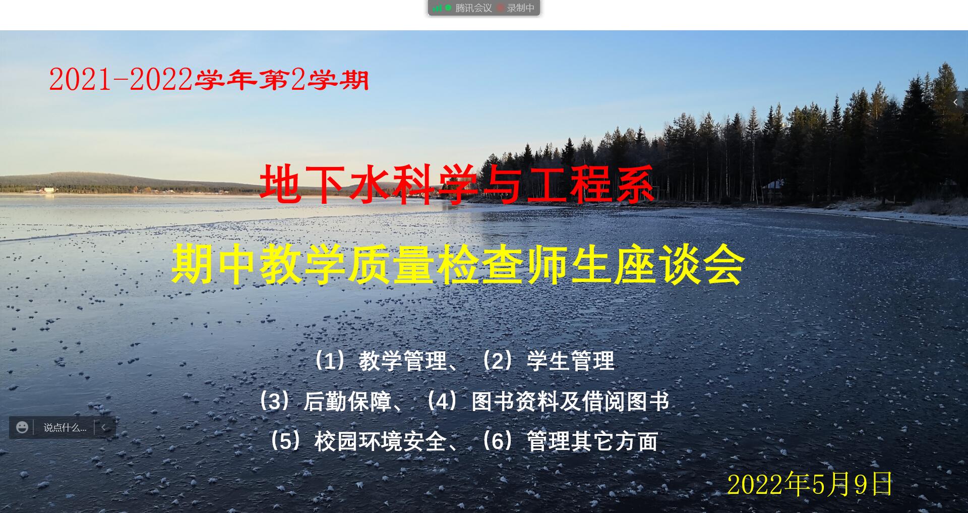 期中教学质量检查实施办法》(长大教〔2012〕296号)文件精神,地下水科学与工程系于5月9日下午,利用腾讯会议召开了2021-2022学年第二学期期中教学质量检查师生座谈会,学院副院长李培月、专业责任教授乔晓英、地下水系主任黄文峰、地下水系教师代表及本科四个年级的学生代表共计30余人参加本次会议。