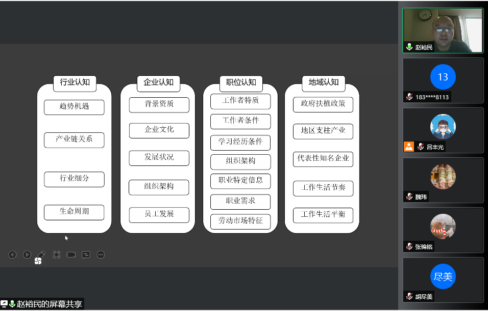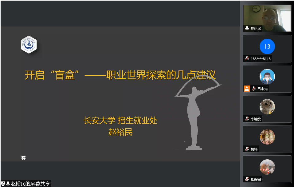 招生就业指导教研室主任赵裕民为研究生做《开启“盲盒”——职业世界探索的几点建议》讲座,为研究生进行线上就业指导,全体毕业班研究生参加,学院党委副书记王妍主持。