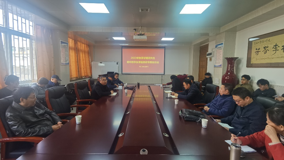 在学院三楼会议室召开2023年秋季学期研究生期中教学检查及课程思政专题座谈会。学院领导、校院两级教学督导、教务员及教师代表和学生代表参加,副院长段磊主持会议。