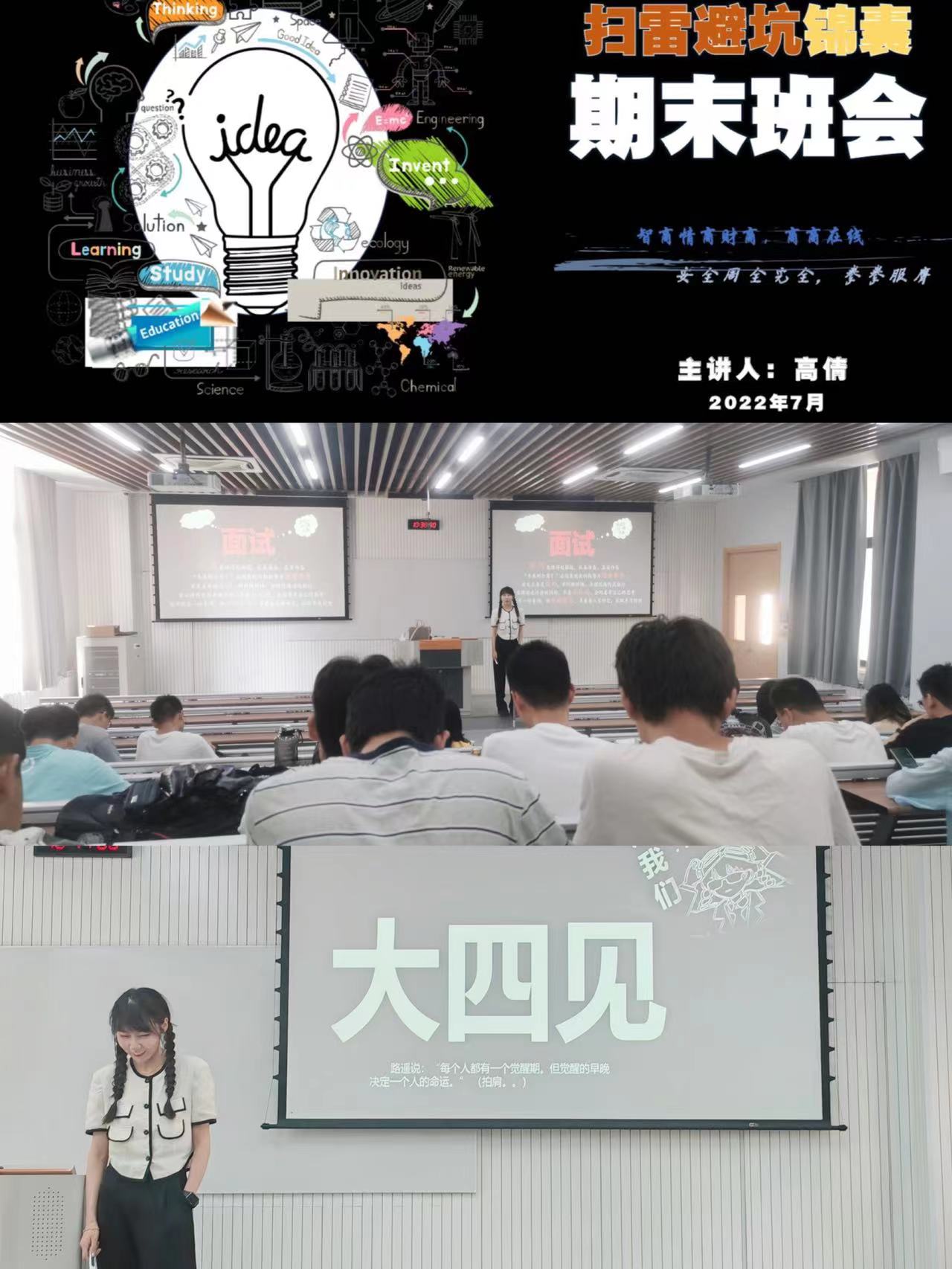 时光飞逝,对于2019级同学来说,宝贵的大学时光已经过去了四分之三,面对大学期间的最后一个暑期生活,该如何高效利用及合理规划,思政班主任高倩于7月4日上午10:30在WX3103为2019290604和2019290605班的同学们开展了一次有针对性的“扫雷避坑”主题期末班会,为举棋不定的同学们送上锦囊,指点迷津。
