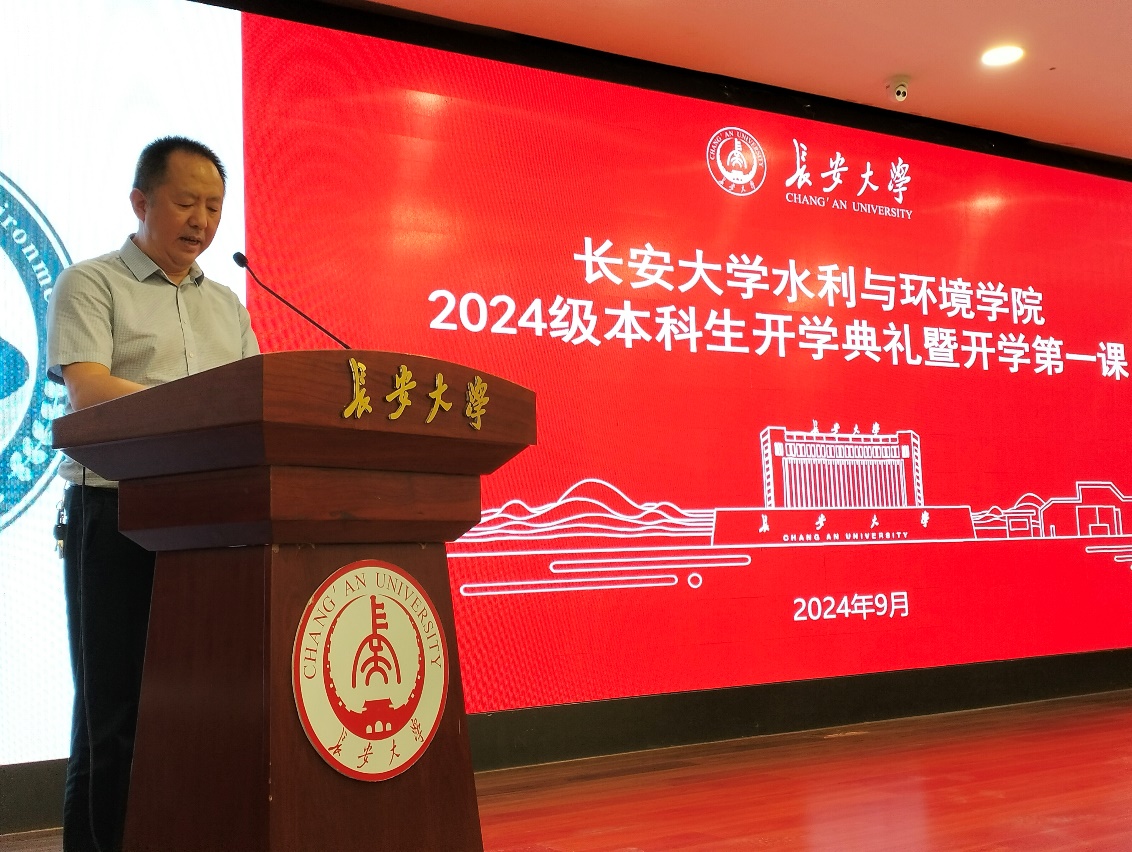 2024级本科生开学典礼暨开学第一课在长安文化艺术中心三楼多功能厅举行,学院党委书记张骞文,院长白波,党委副书记、副院长荆琳,副院长段磊、张洪波出席活动,典礼由学院党委副书记刘扬主持。